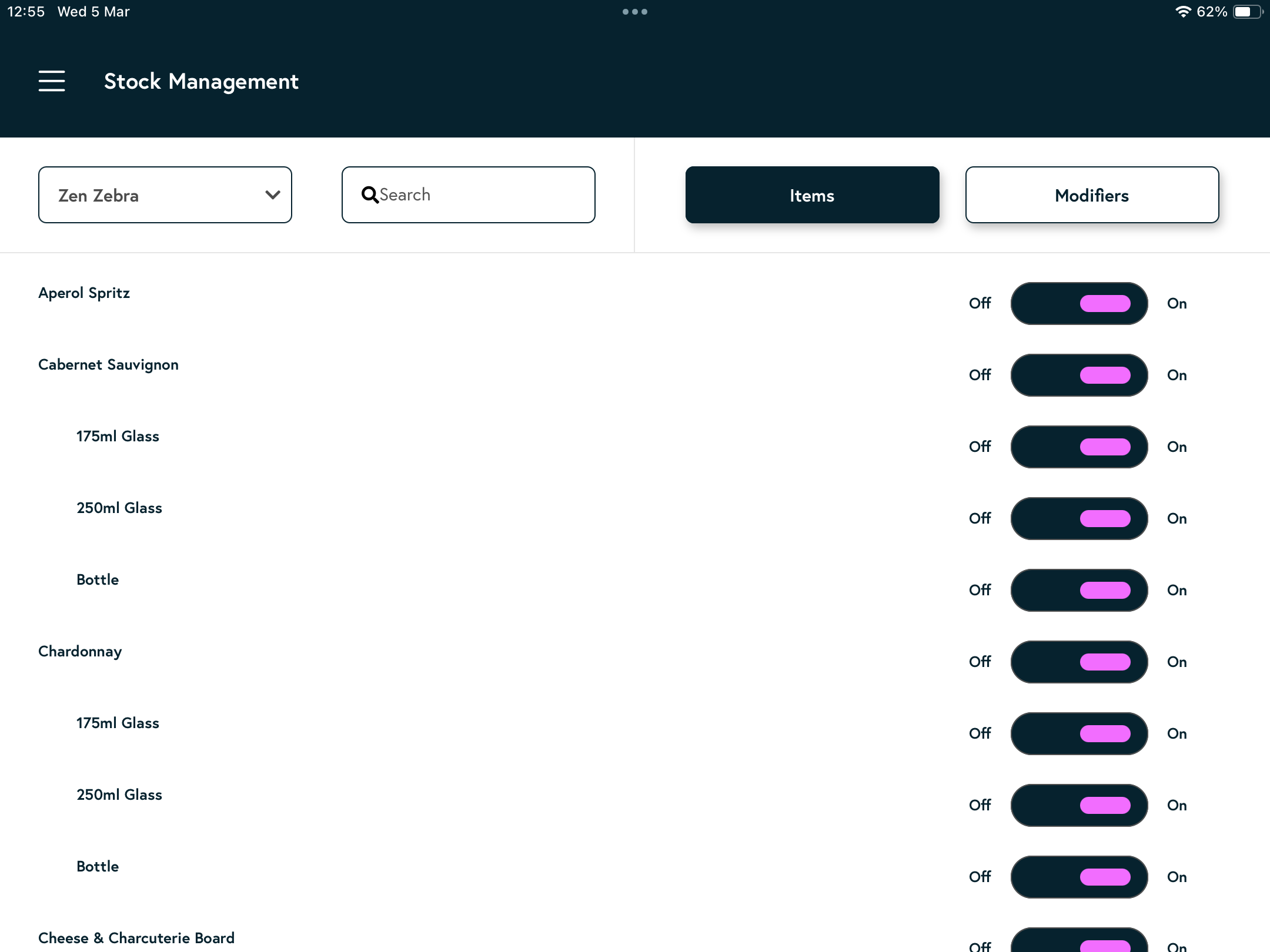 - Toggle Off to remove an item from online and till availability.