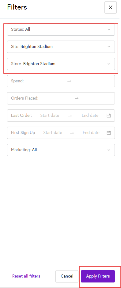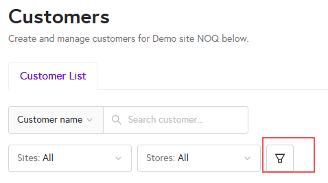 4. You can also filter customers from this page. Click on the funnel icon to open the filter panel, then enter your filter details. For example, you can select a particular store or site and apply the filters to narrow down the list. Once applied, only the customers matching your selected criteria will be displayed.