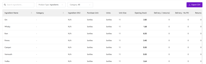 4. Once the report is generated, you can filter by product type (e.g. items or ingredients) and by their adjacent category. If you want to search for a particular item or ingredient, you can also use the search bar. To view and download the full report, click Export CSV in the top-right corner.
