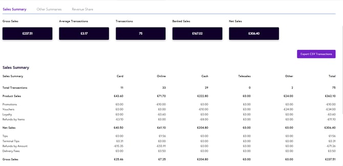 - Below this, you will see all transactions processed via card, online, telesales, cash, and any other payment methods used by the site.