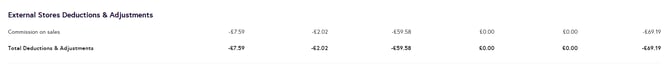 - Under the Sales Summary section, there is a External Stores Deduction & Adjustment. This shows total commission & adjustment fees you have received from any external businesses.