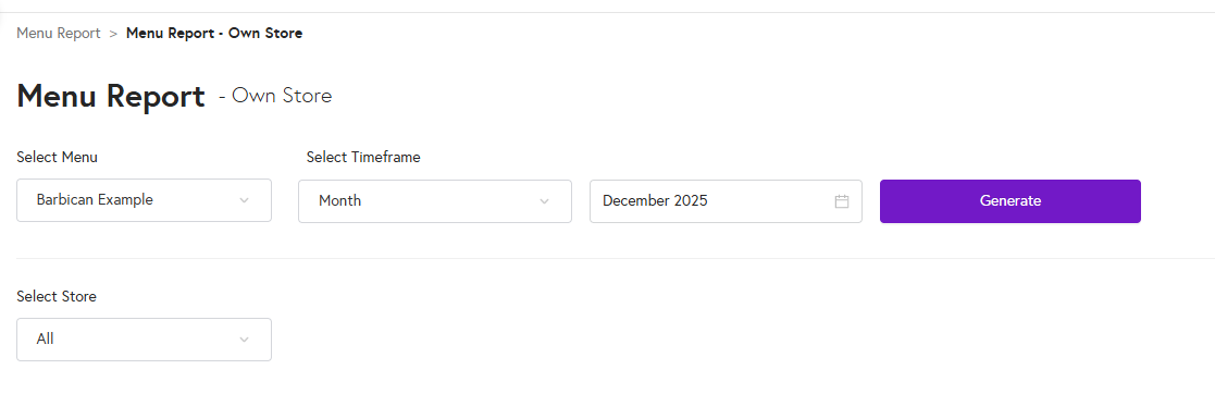 4. From the “Select Menu” dropdown, choose the menu you want to download a report for. Then select the time frame, choose the relevant stores for which you want to generate the report, and click Generate.