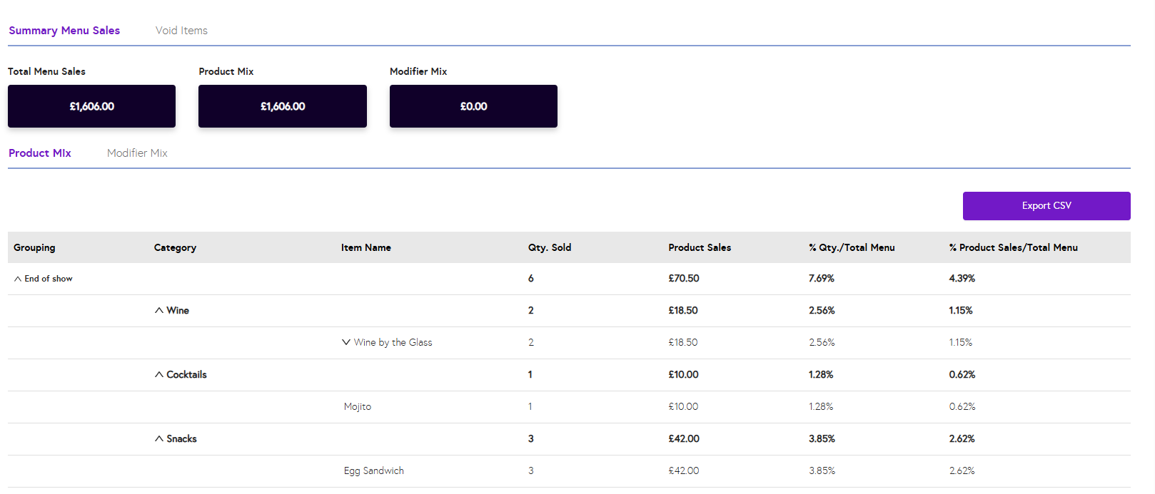 5. You will now see your menu report, including total menu sales and sales broken down by category and item. To download the data, click Export CSV in the top-right corner.