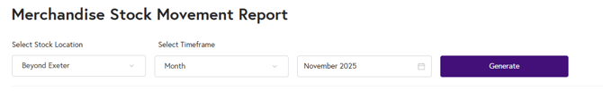 3. Under the stock report, select your stock location, choose the desired time frame, and click Generate. This will create an Merch inventory stock movement report for you.