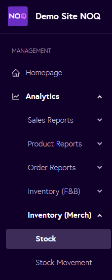 2. From the left-hand navigation panel, go to Analytics > Inventory (Merch) > Stock.