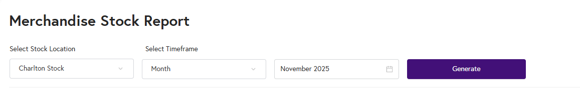 3. Under the stock report, select your stock location, choose the desired time frame, and click Generate. This will create an Merch inventory stock sales report for you.