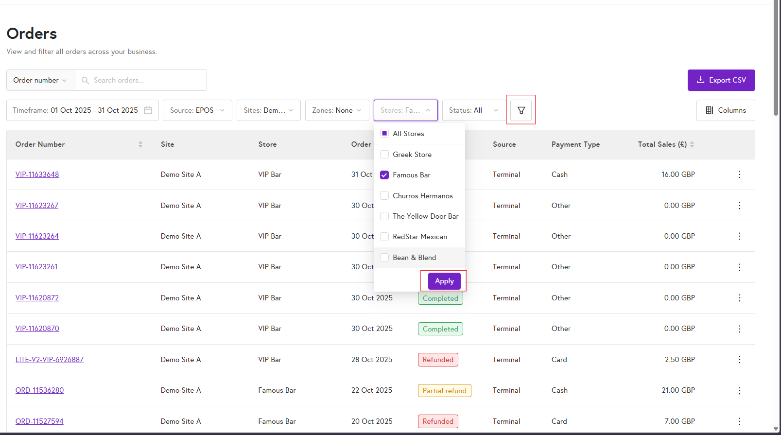 4. Use the Stores drop-down to filter orders by specific store. To add more filters, click the funnel icon to open the filters menu.