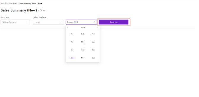 4. From the first dropdown, select the Store. Then choose the timeframe you want the report for — Day, Week, Month, Year, or a custom date range. Click on Generate to create the summary report.