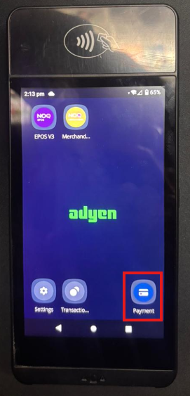 When you switch on your terminal, you will see a payment app in the top right corner of the screen. This is a standalone payment app, separate from the NOQ EPOS app, as shown in the picture below.