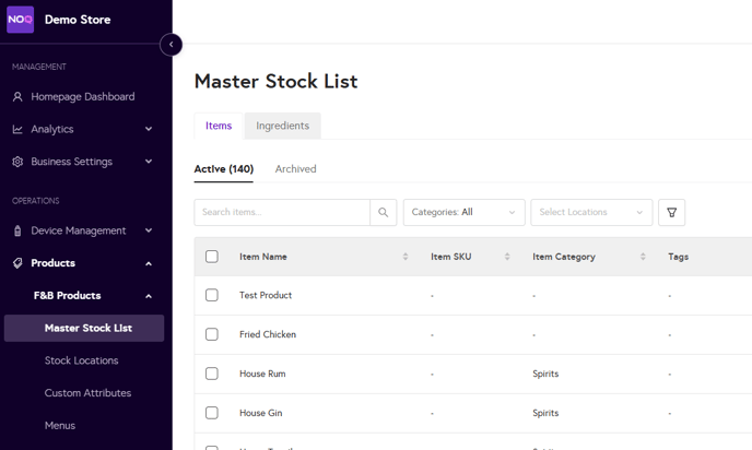 - Go to the NOQ Backend Portal > Products > F&B Products > Master Stock List > Items.