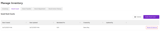 7. After saving stock count you need to approve the stock count. Under stock count tab you will all saved stock counts list. Click on Review & Approve option.