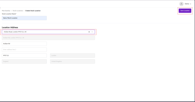 4.Enter the name of the stock location. Then, in the first search bar under Location Address, enter the postal code for the stock location. The system will automatically populate some address fields. You can complete the remaining details or leave them as they are. Click Save location to create the new stock location.