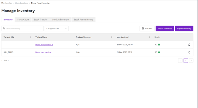 From here, you can perform Stock Count, Stock Transfer, Stock Adjustment, view Stock Transfer History, and Import/Export the current inventory.