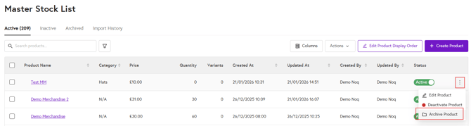 In the Master Stock List under the Active tab, click the three dots next to the product you want to archive