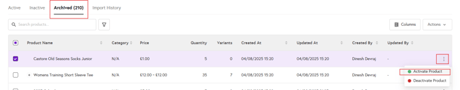 In the Master Stock List, go to the Archived tab, click the three dots next to the product you want to activate, and select Activate product.