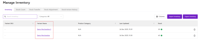 4. Here you will see items list. Under Variant name column, click on the name you want to edit/add SKU & barcode.