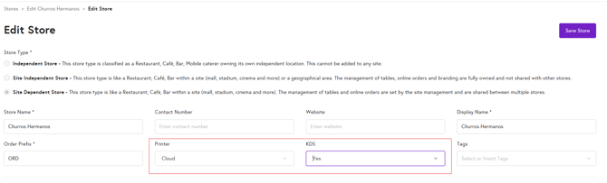 3. In the store profile, ensure that both Printer and KDS are selected.