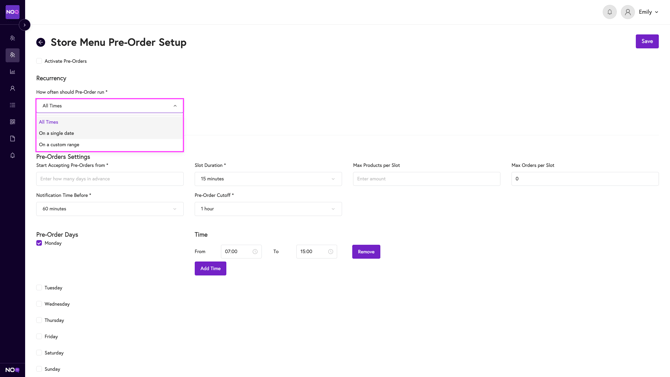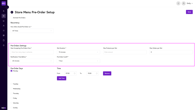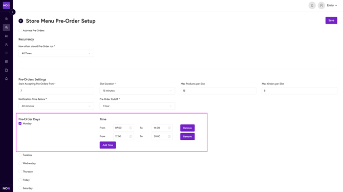 - Select the times for when you want pre-orders functioning