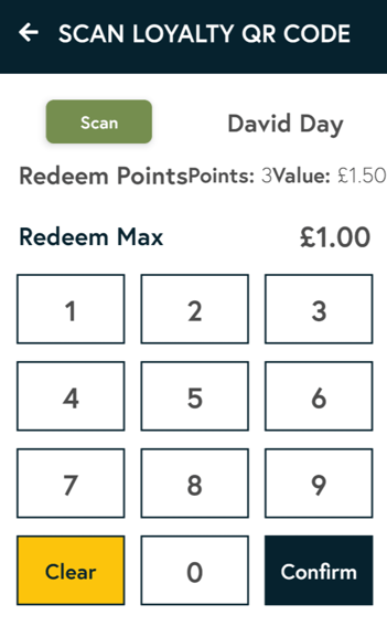- Enter a discount value if they wish to redeem points, then press Confirm and checkout as normal.