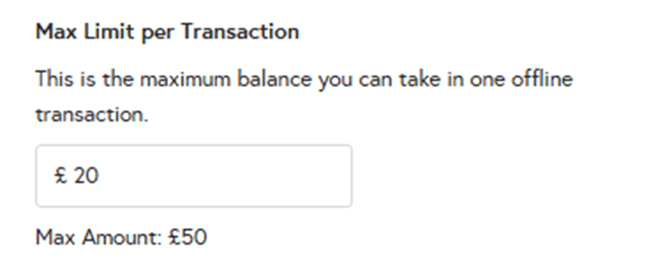 The next field sets the ‘Maximum Limit Per Transaction’ – this is the amount a customer can spend per transaction in offline mode