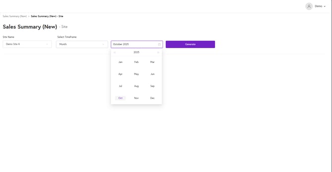 3. From the first dropdown, select the Store. Then choose the timeframe you want the report for - Day, Week, Month, Year, or a custom date range. Click on Generate to create the summary report.