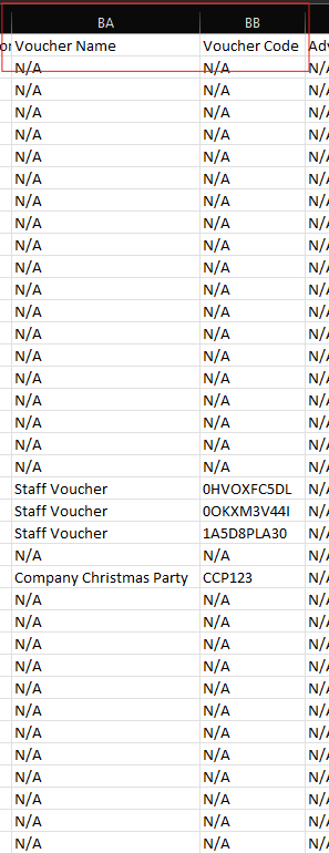 - To view the voucher summary in a CSV file, open the exported CSV and look for columns BA and BB, which show the Voucher Name and Voucher Code.