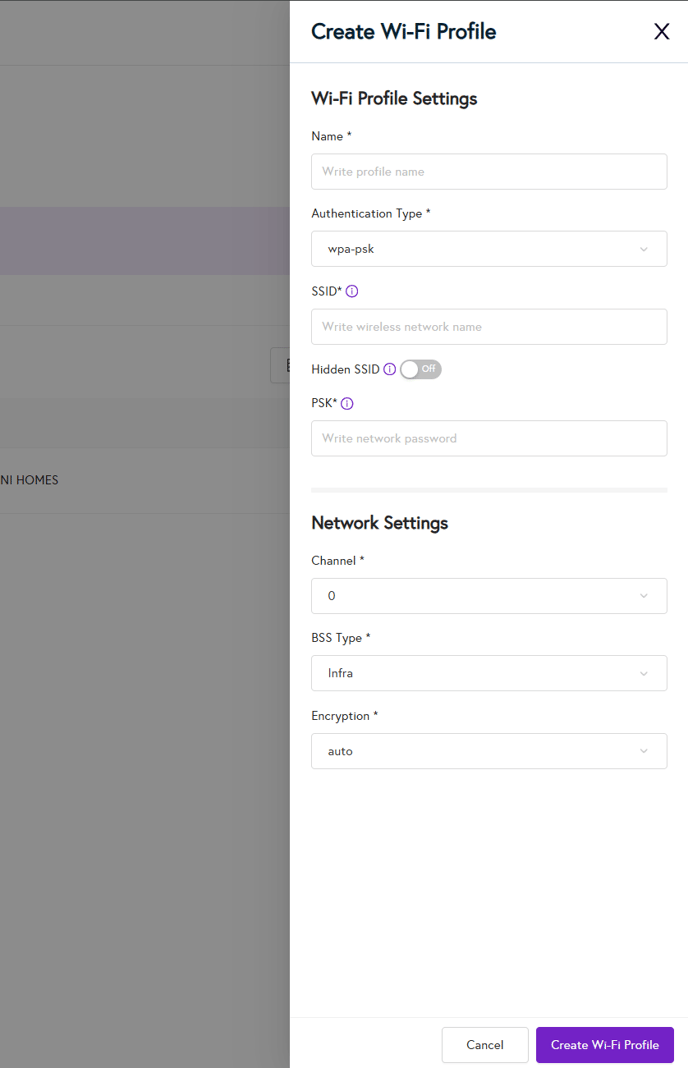 - Click 'Create Wi-Fi Profile' to open the side menu.